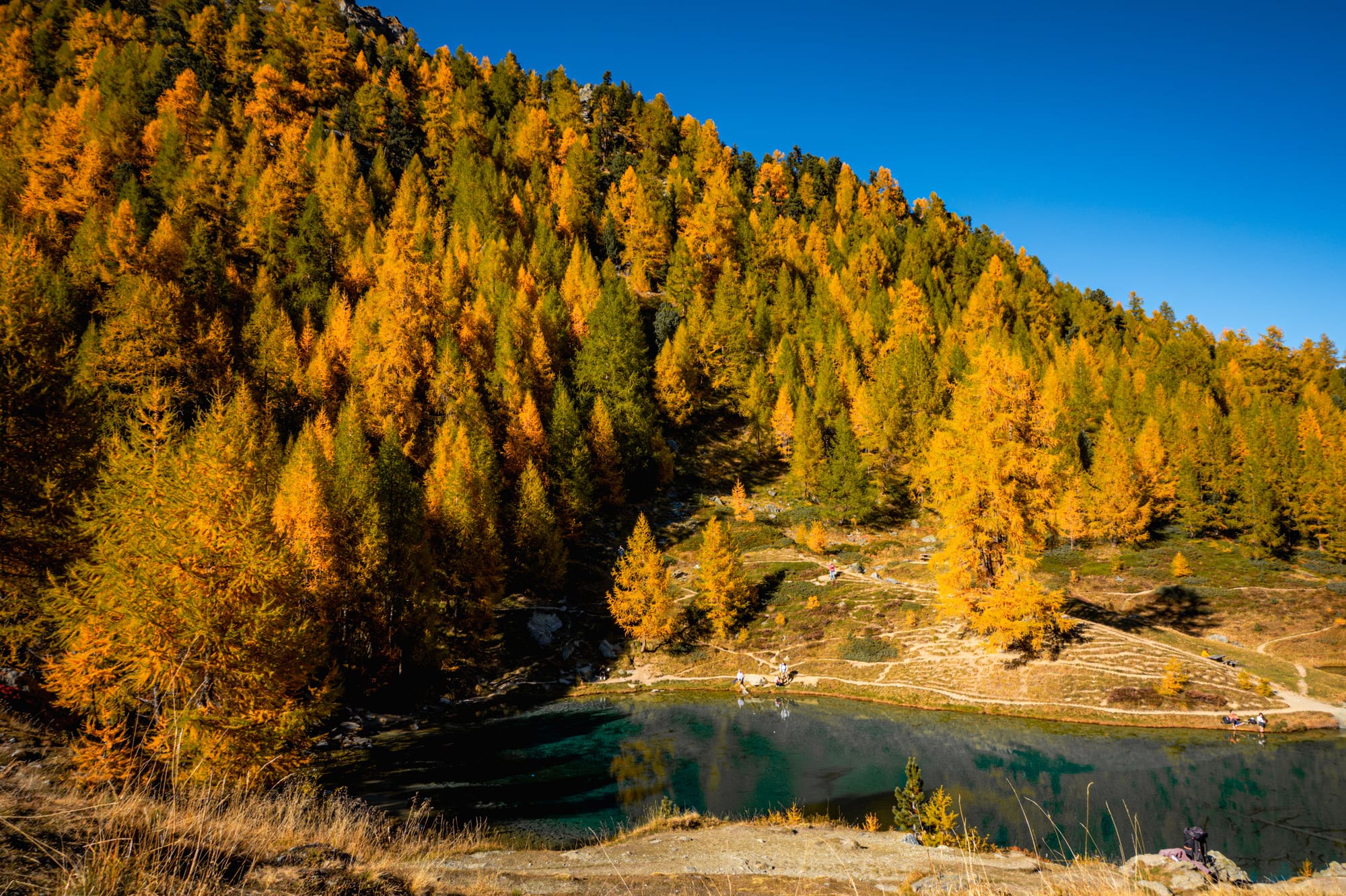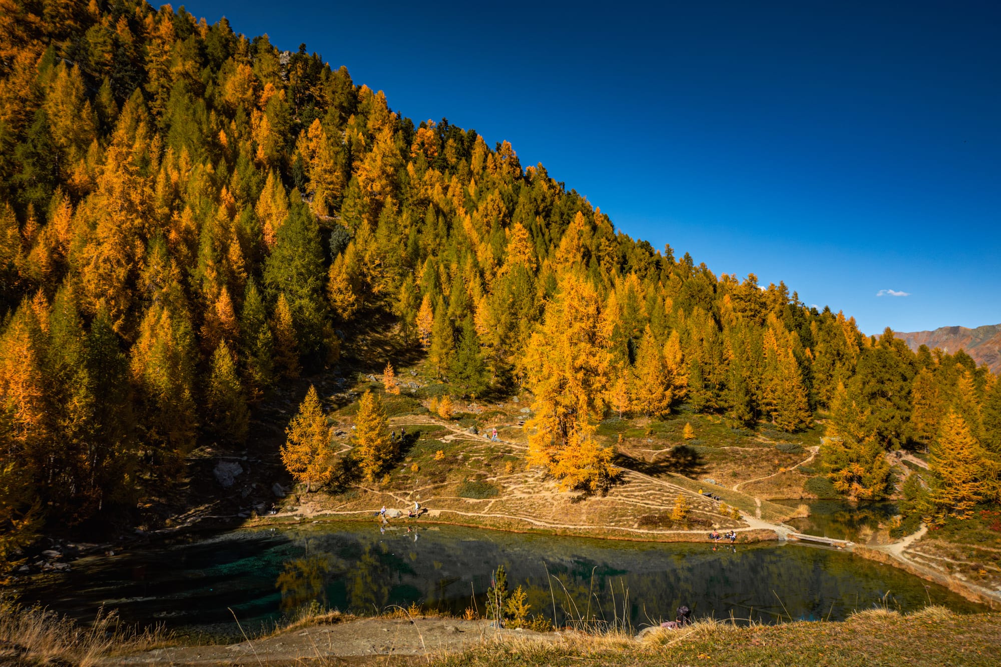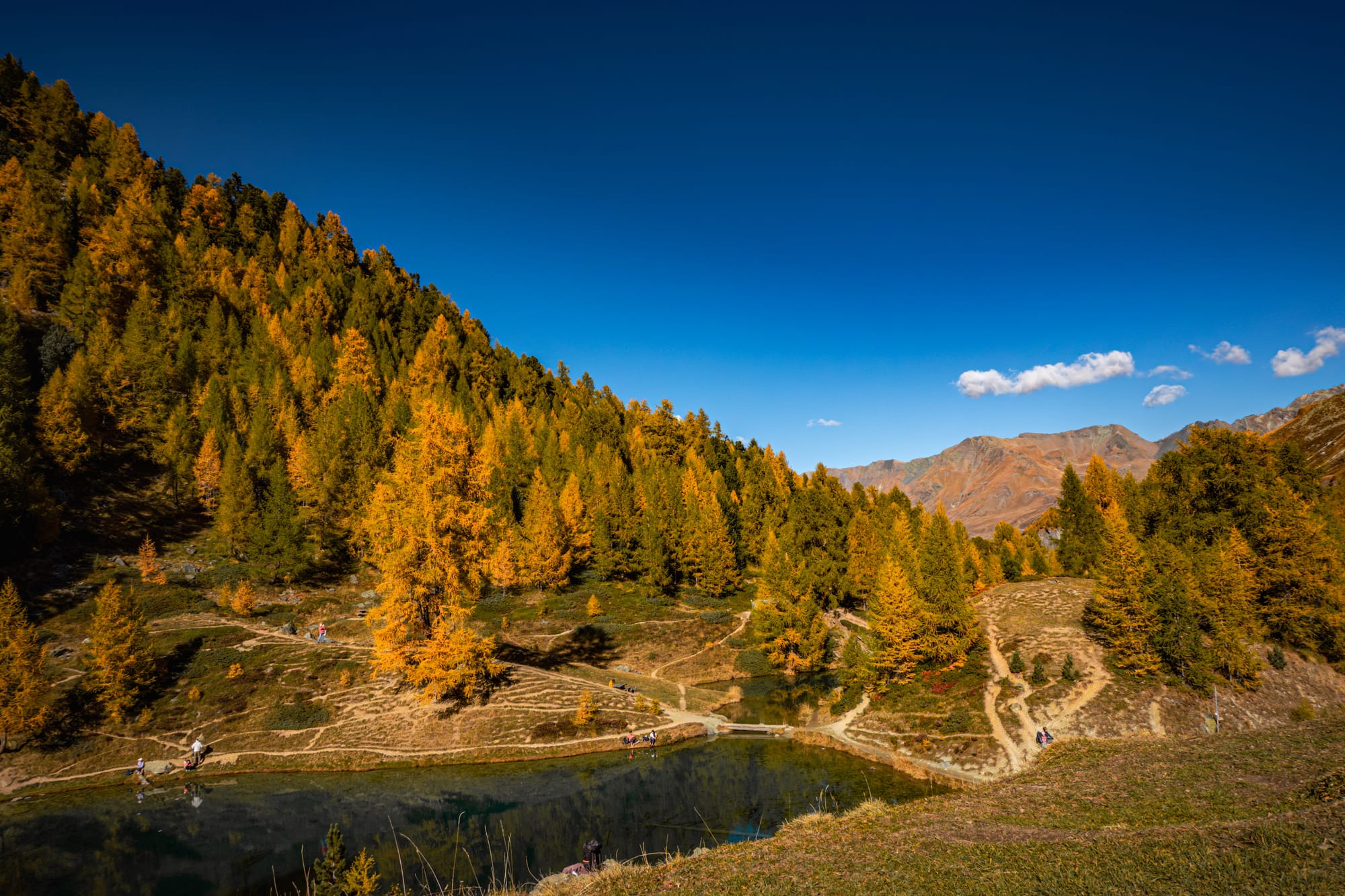 Mais la fatigue retombée, l'émerveillement revenu, c'est vrai que c'est beau ! Surtout en cette période d'automne flamboyant : arbres verts, jaunes et orange, ciel bleu et grand soleil et lac finalement plutôt photogénique.